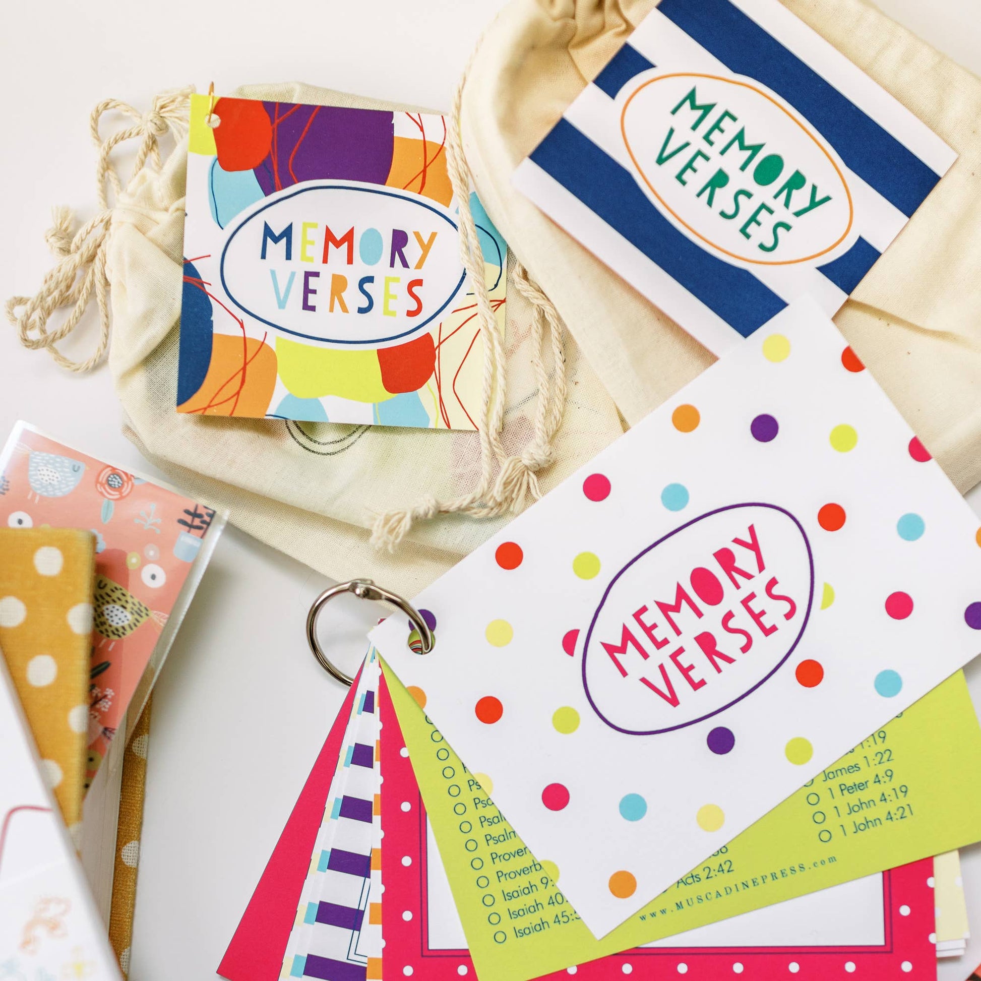 Item Details: Ring of 20 patterned index cards. Includes list of 45 verses to know. Printed on heavy card stock. Packaged in a hand-stamped cotton bag. Designed and printed in America.