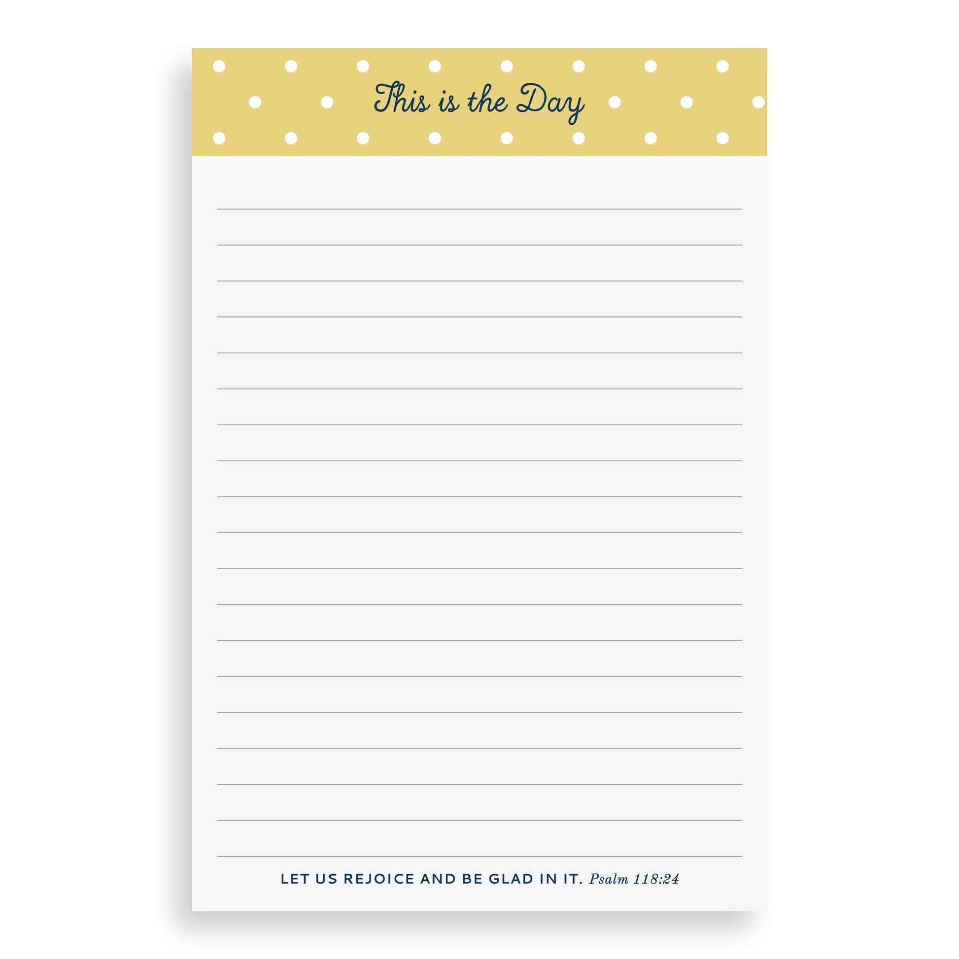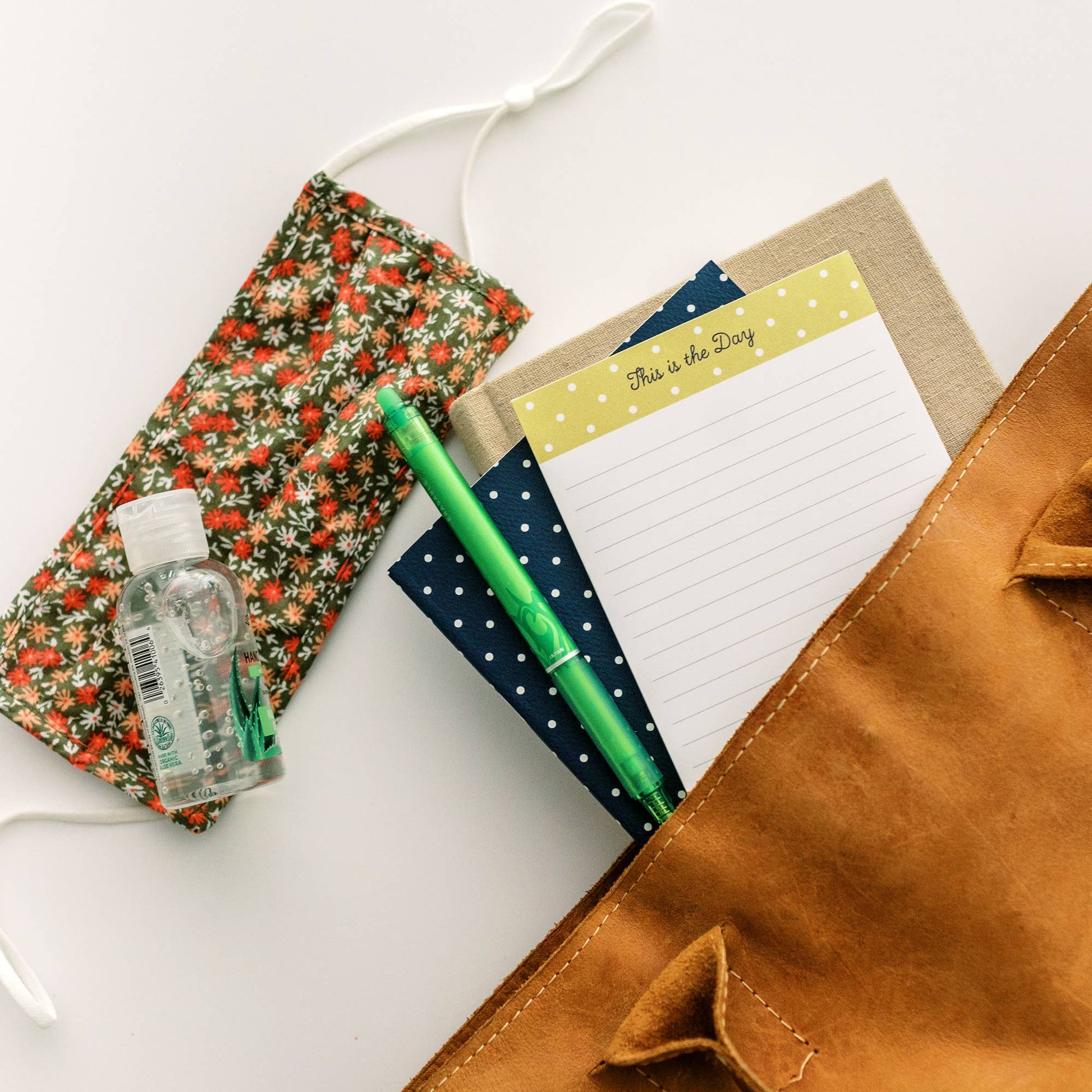 This simple little notepad is the perfect place to keep track of your daily to dos. Patterned with simple polka dots on a marigold background, let this cheerful little pad remind you to rejoice even when the lists are long and the days are longer.