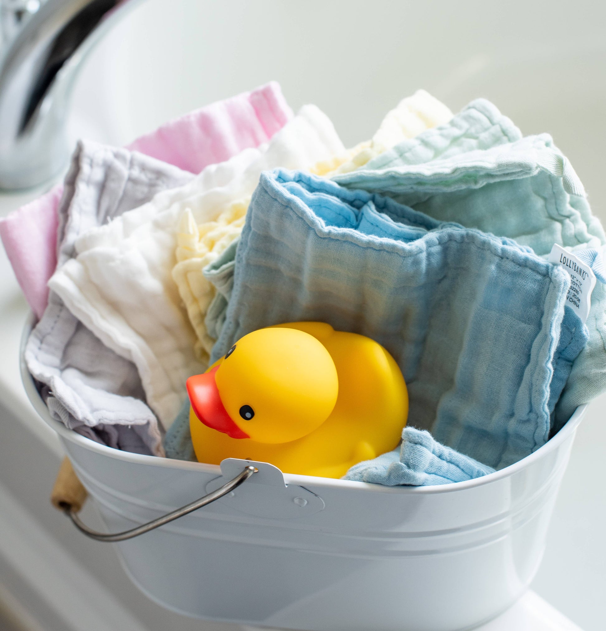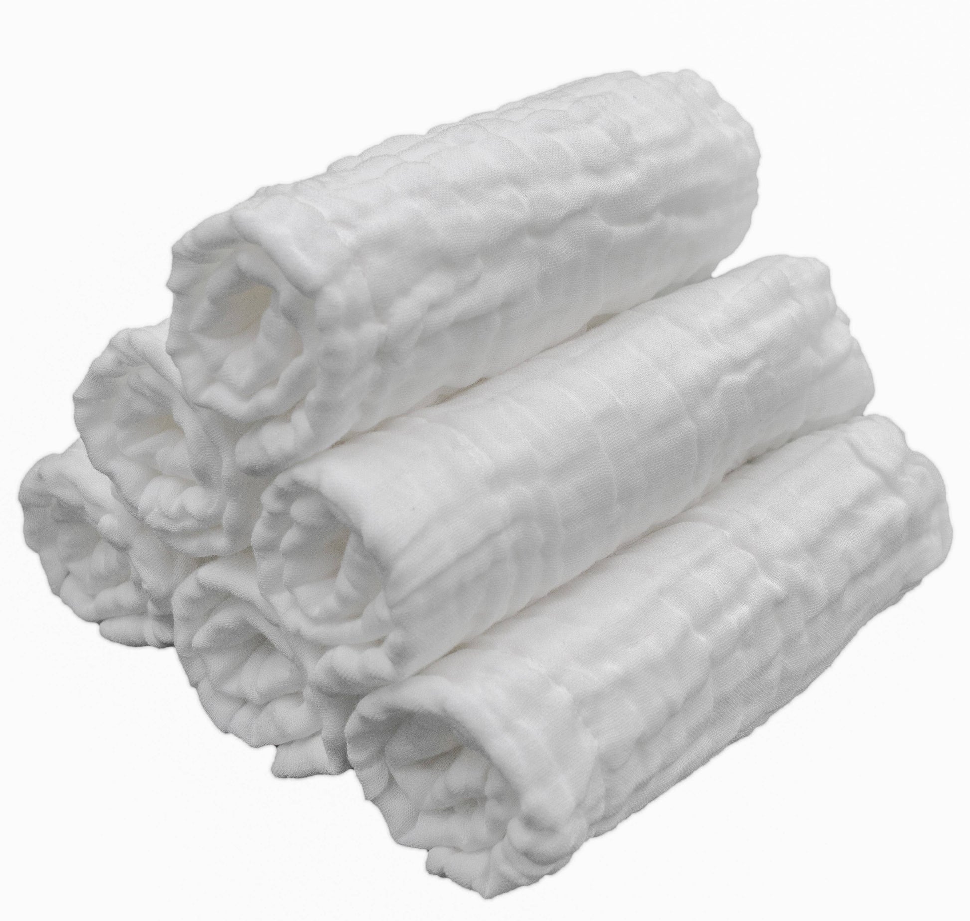 100% MUSLIN COTTON - 6 layers of absorbent cotton, perfectly soft for even the most sensitive newborn baby's skin. Large 12" x 12" size makes it perfect for any bath or clean up.