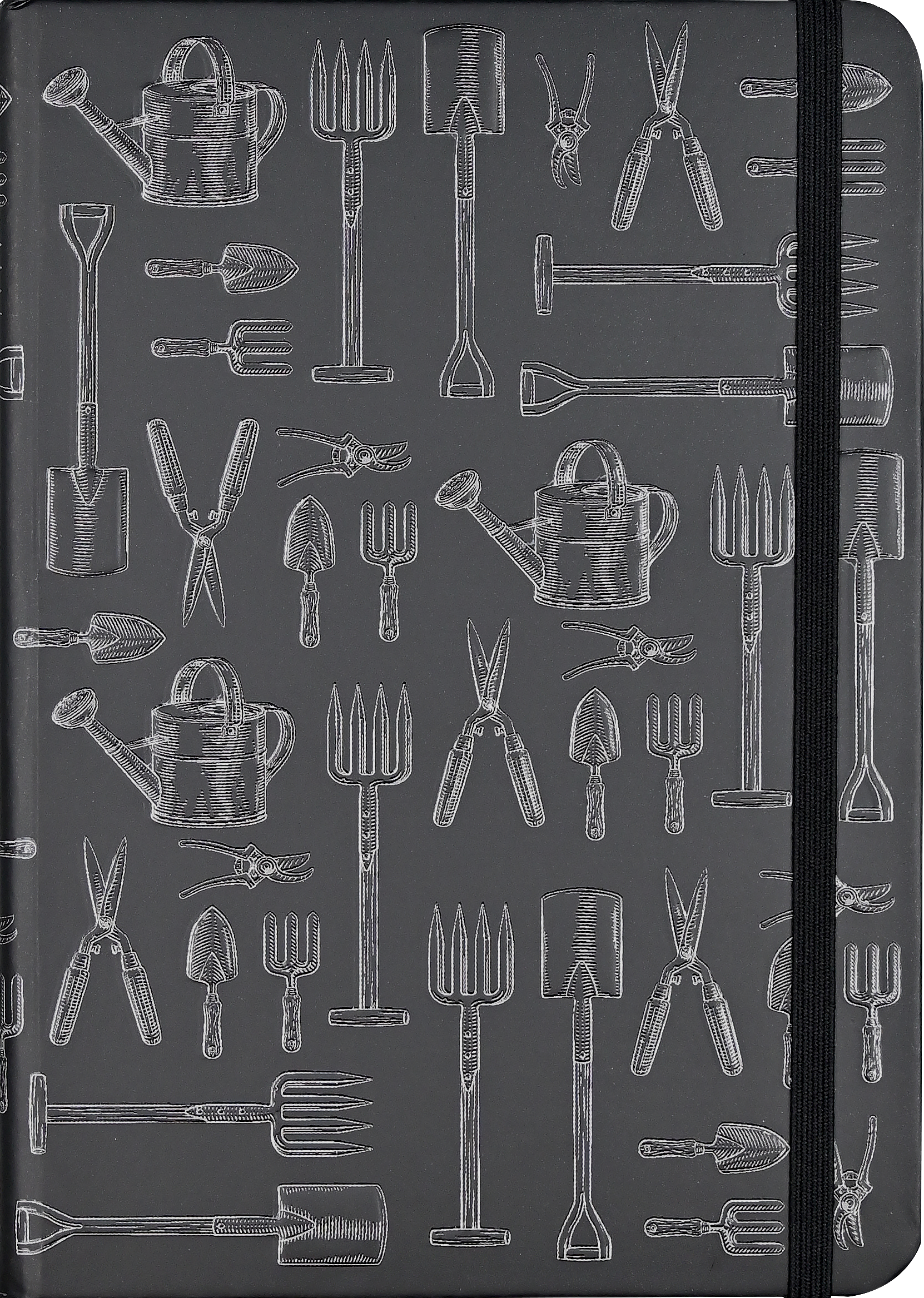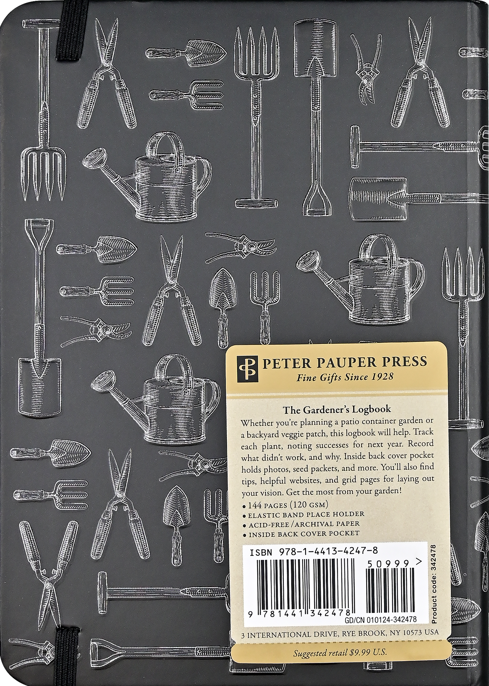 Whether you're planning a patio container garden or a backyard veggie patch, this logbook can help! • Plant Log pages allow you to track each plant you choose, from its beginnings in your garden through the growing season and beyond. • Note successes for next year. • Note what didn't work and why. • Tuck photos, seed packets, and garden center receipts within the inside back cover pocket. • Includes general gardening tips, helpful websites, and dot-matrix grid pages for laying out your vision. • Get the most from your garden! • Sturdy hardcover binding. • ''Vintage Garden Tools'' cover design is embossed and embellished with gloss highlights. • Elastic closure. • Archival/acid-free 120 gsm paper. • Inside back cover pocket. • Removable cover band. • 5'' wide x 7'' high. • 144 pages.