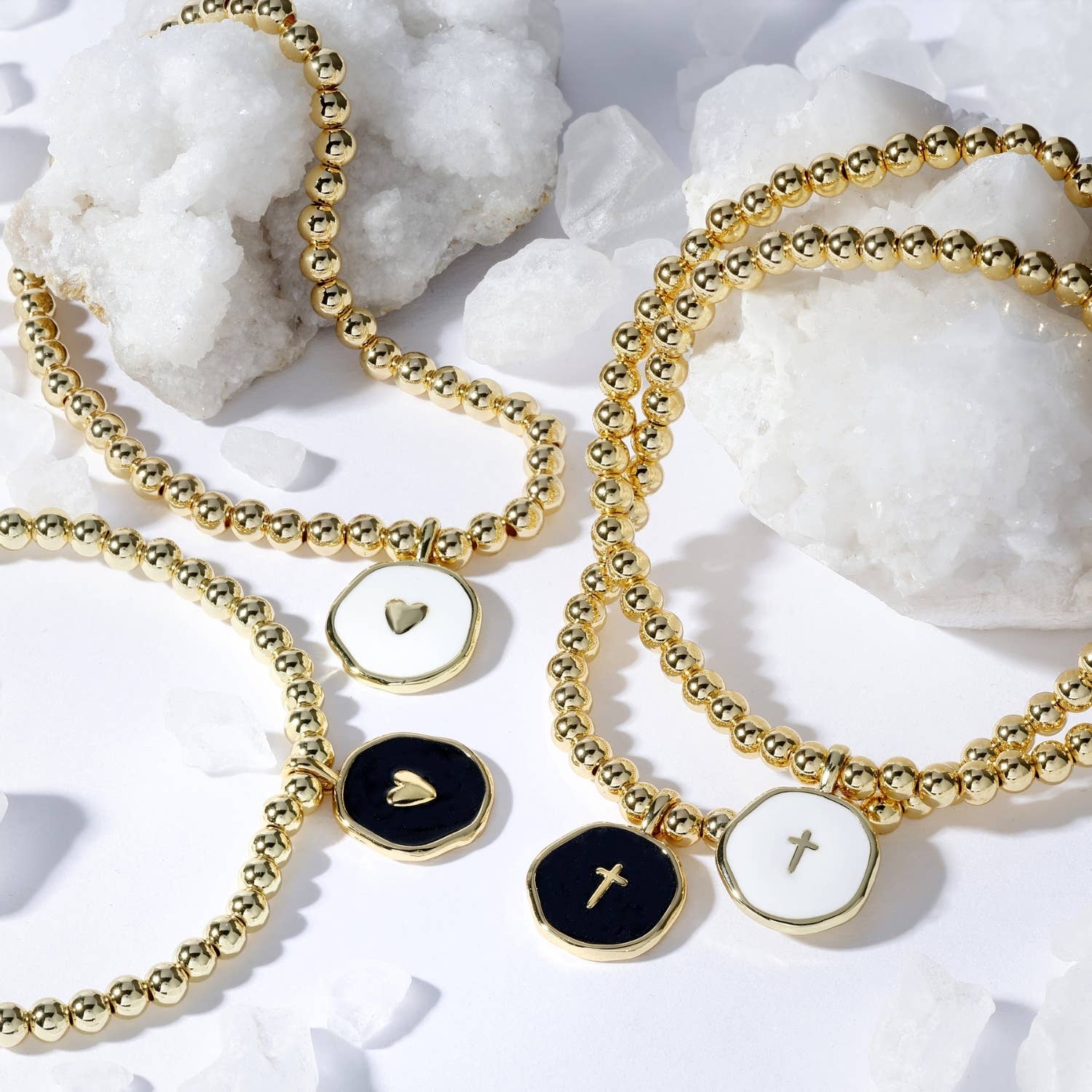 Beaded stretch bracelet with an enamel-filled charm and a delicate gold cross, perfect for those seeking spiritual inspiration. Faithful and up-lifting.